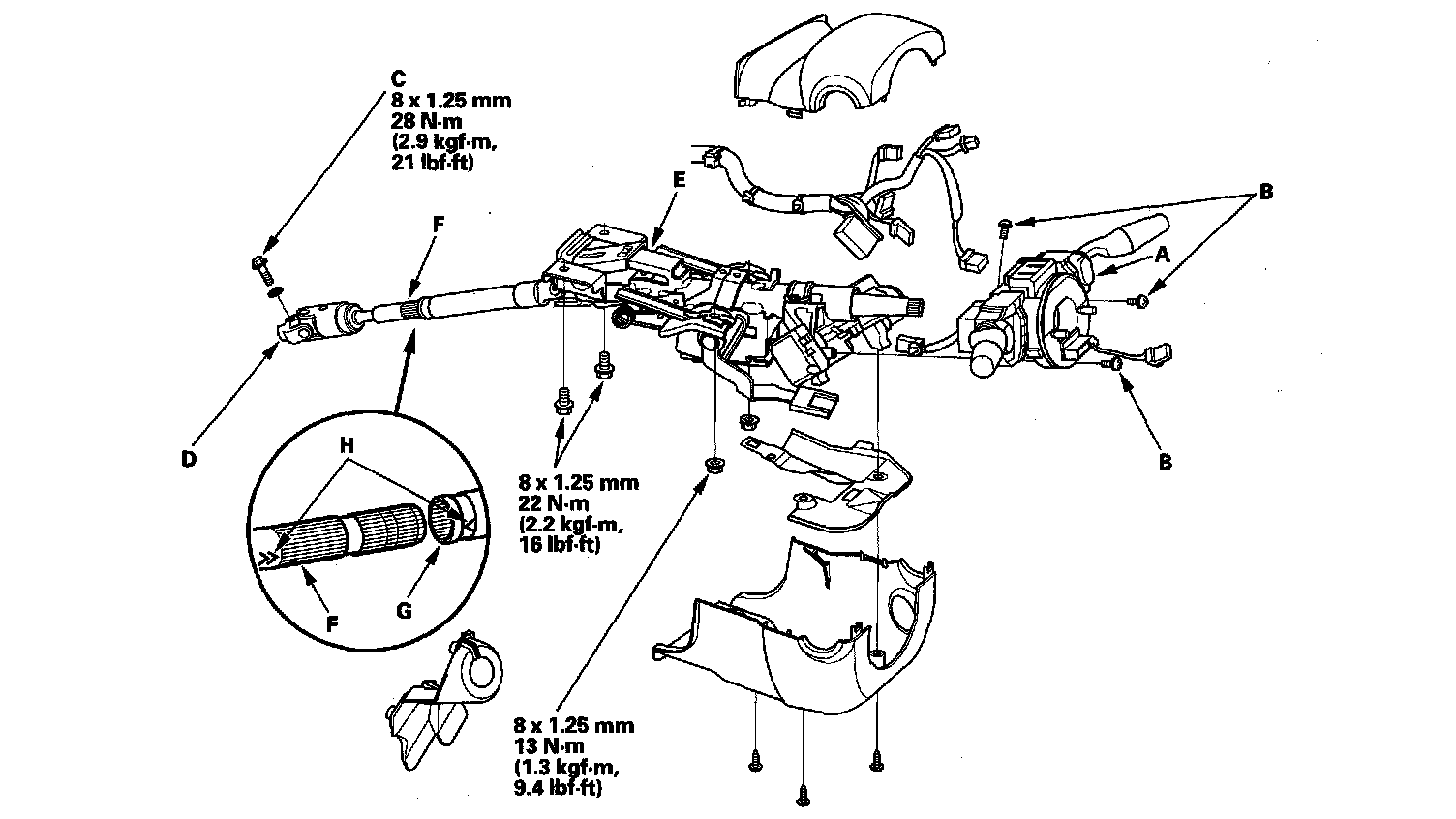 15. Remove the steering column (E) by removing the attaching nuts and bolts. If the lower slide shaft (F) is removed, slip it into the upper shaft (G) by aligning the paint or stamped marks (H).