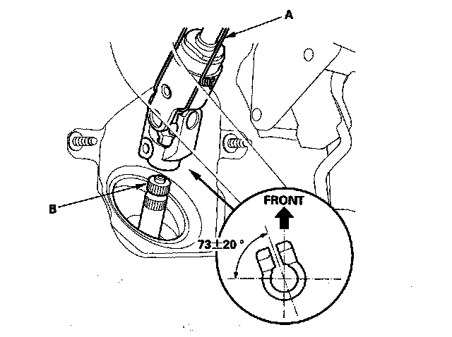 3. With the rack in the straight ahead driving position, cut the wire (A) and slip the lower end of the steering joint onto the pinion shaft (B) in the range shown.