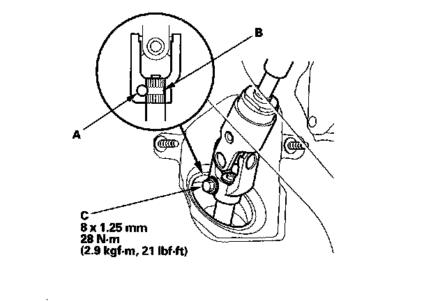 4. Align the bolt hole (A) on the steering joint with the groove (B) around the pinion shaft, and loosely install the joint bolt (C). Be sure that the joint bolt is securely in the groove in the pinion shaft. Pull on the steering joint to make sure that the steering joint is fully seated. Tighten the steering joint bolt to the specified torque.