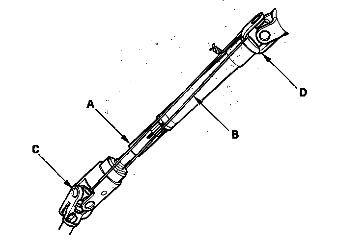 8. Hold the lower slide shaft (A) on the column with a piece of wire (B) between the joint yoke (C) of the lower slide shaft and joint yoke (D) of the upper shaft to prevent the slider shaft from pulling out.