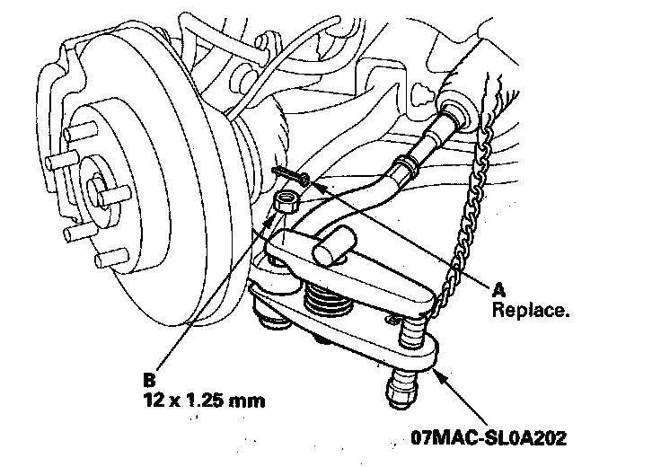 24. Wipe off any grease contamination from the ball joint tapered section and the threads. Reconnect the tie-rod ends (A) to the steering knuckles. Install the 12 mm nut (B), and tighten it.