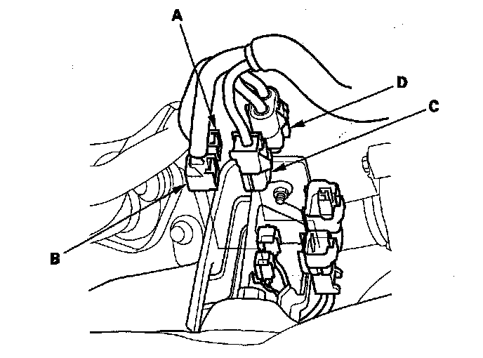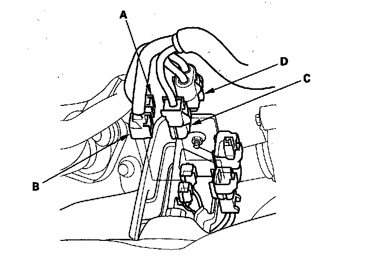 22. Remove the vinyl tape, then connect the torque sensor 4P connector (A), EPS motor angle sensor 6P connector (B), EPS motor 1P connector (C), and EPS motor 2P connector (D) to the steering gearbox. Make sure to push these connectors until you hear a click so that the connectors are secured.