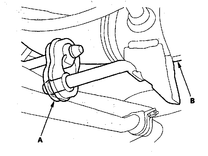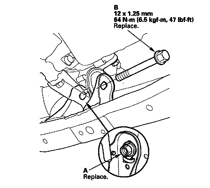 13. Install the new nut (A) and the new front engine mounting bolt (B), and tighten the mounting bolt to the specified torque.