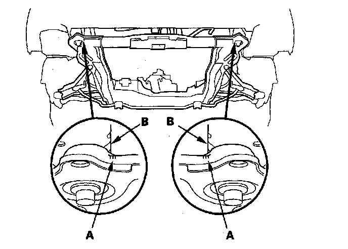 10. Align the front subframe reference marks (A) to the body (B), as noted, during removal.