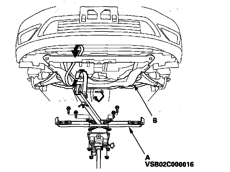 24. Attach the front subframe adaptor (A) to the front subframe (B) and the transmission jack (model number LSL-W9371) or the powertrain lift (model number OTC-1585), then tighten the front subframe adaptor screw.