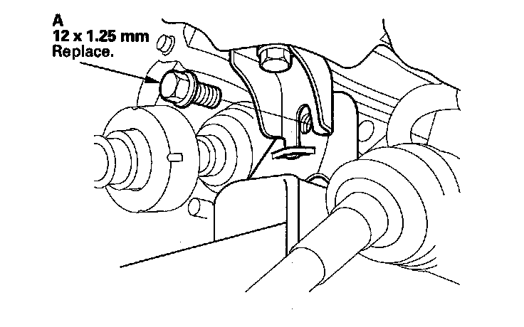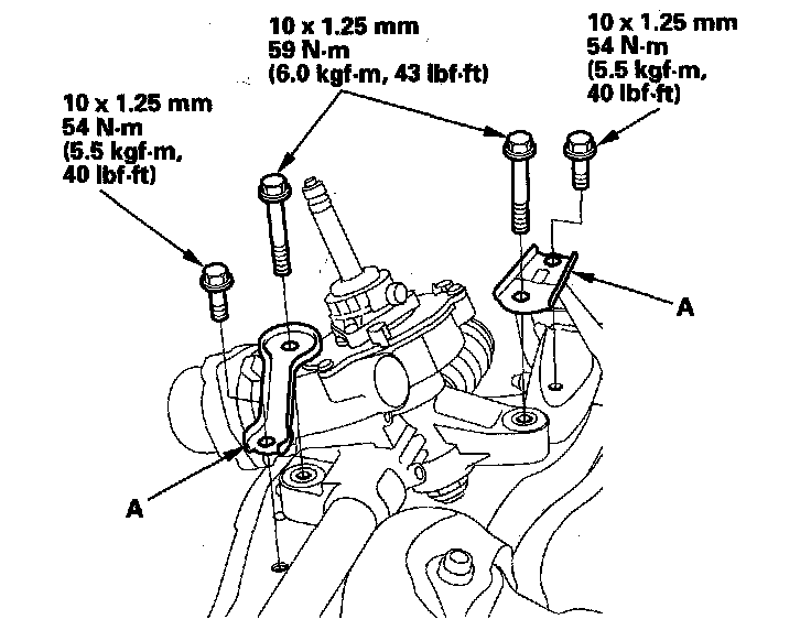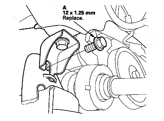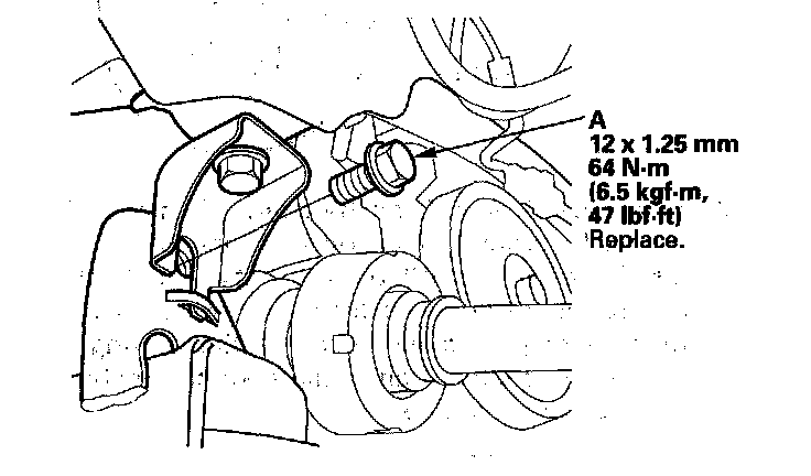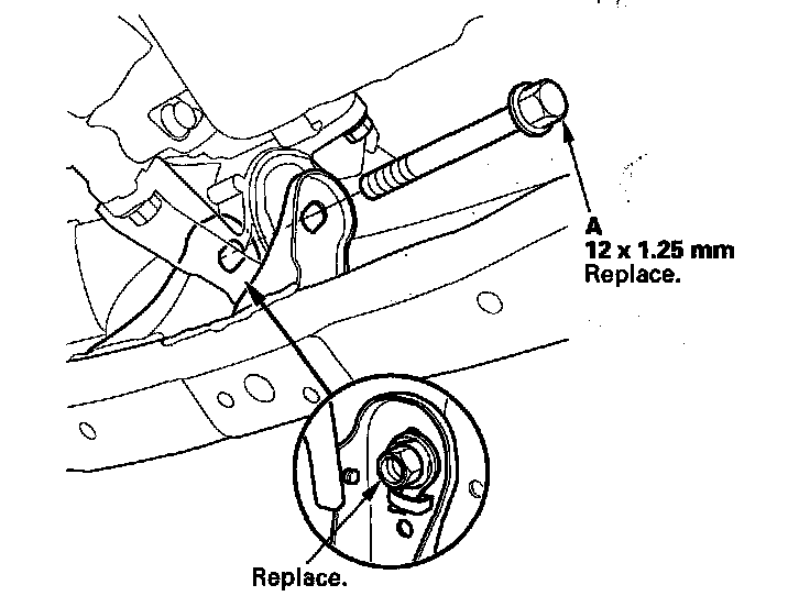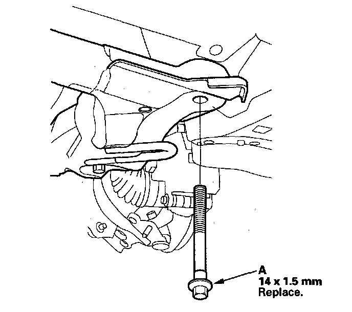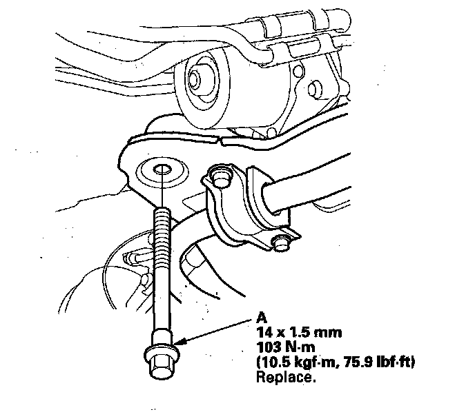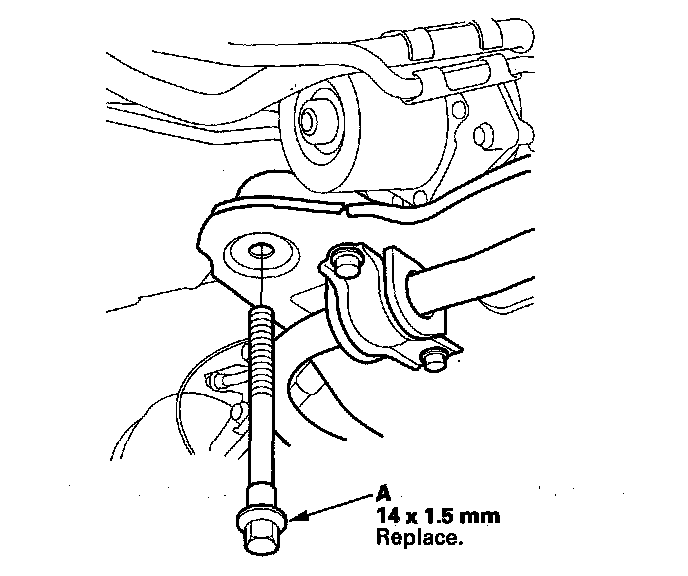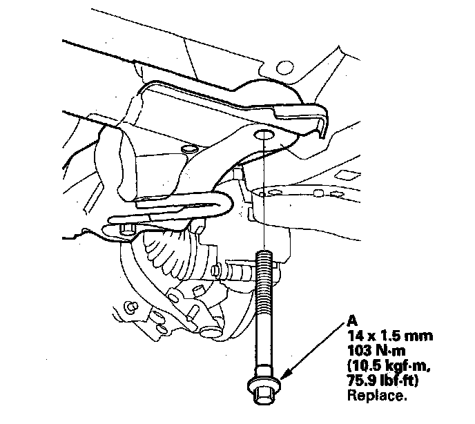 17. Install the new front subframe middle mount bolt (A) on the fight side, and tighten it to the specified torque.