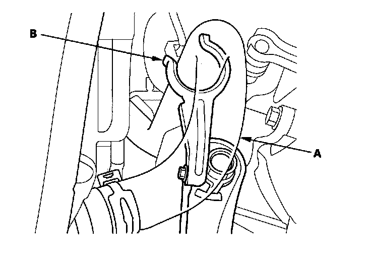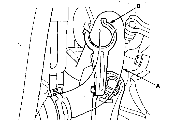 14. Install the lower radiator hose (A) to the radiator hose stay (B).