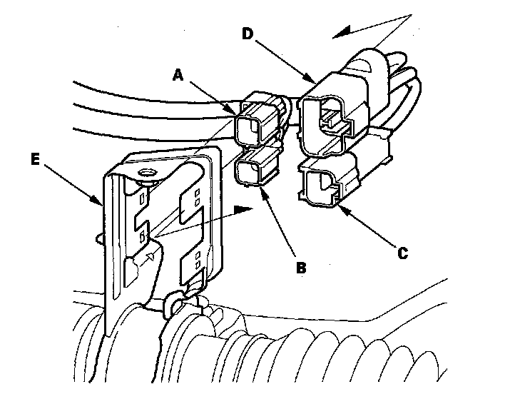 7. Install the torque sensor 4P connector (A), EPS motor angle sensor 6P connector (B), EPS motor 1P connector (C), and EPS motor 2P connector (D) on the right side of the gearbox mounting bracket (E).