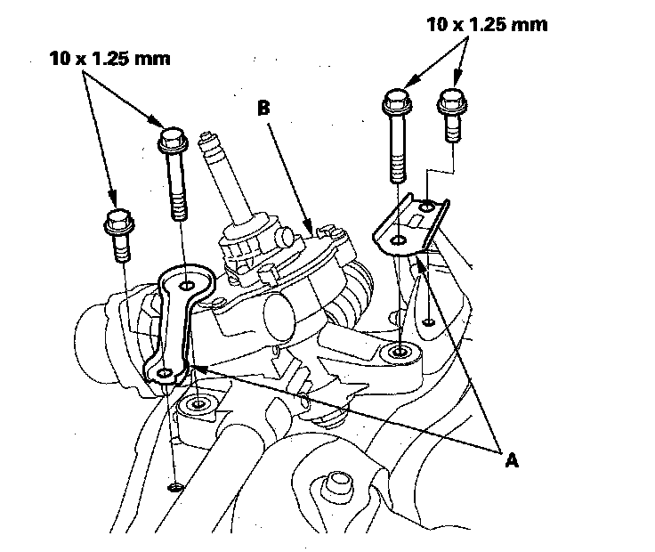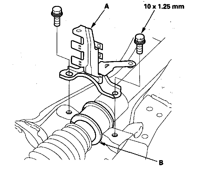 37. Remove the two 10 mm bolts from the right side of the steering gearbox, then remove the gearbox mounting bracket (A) and the mounting cushion (B).