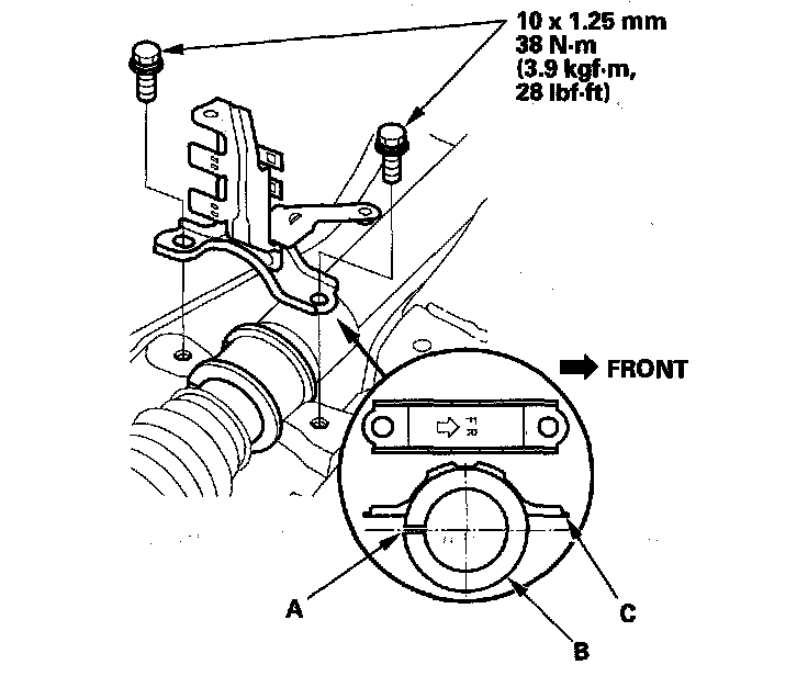4. Install the gearbox mounting bracket (C) over the mounting cushion, and loosely install the two 10 mm bolts.