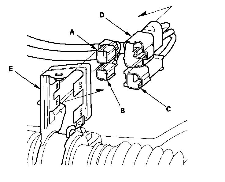 35. Remove the torque sensor 4P connector (A), EPS motor angle sensor 6P connector (B), EPS motor 1P connector (C), and EPS motor 2P connector (D) from the passenger's side of the gearbox mounting bracket (E).