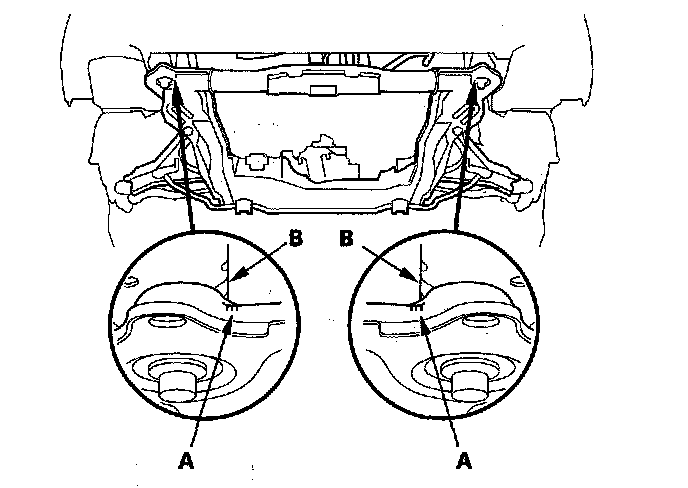 23. Note the reference marks (A) on both sides of the subframe that line up with the body (B).