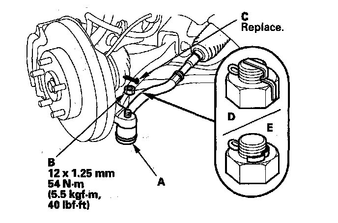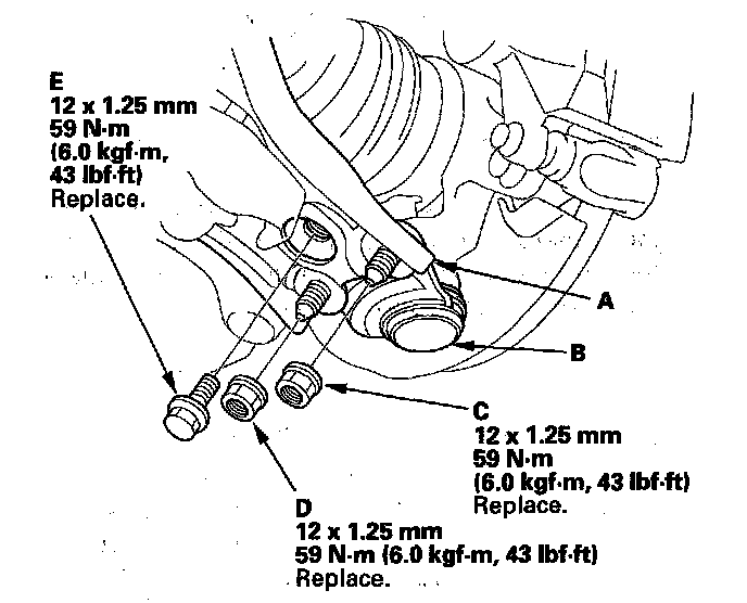 21. Install a new flange bolt and the new self-locking nuts. After lightly tightening all three fasteners, tighten them to the specified torque in the following order; the flange nut on the front (C), the flange nut on the rear (D), then the flange bolt (E).