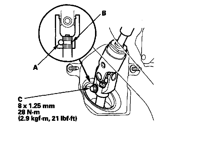 30. Align the bolt hole (A) on the steering joint with the groove (B) around the pinion shaft, and loosely install the joint bolt (C). Be sure that the joint bolt is securely in the groove in the pinion shaft. Pull on the steering joint to make sure that the steering joint is fully seated. Tighten the steering joint bolt to the specified torque.