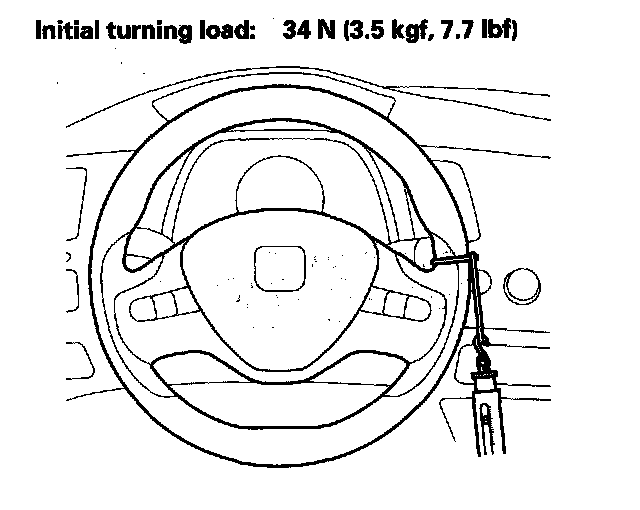 3. Attach a commercially available spring scale to the steering wheel. With the engine idling and the vehicle on a clean, dry floor, pull the scale as shown and read it as soon as the tires begin to turn.
