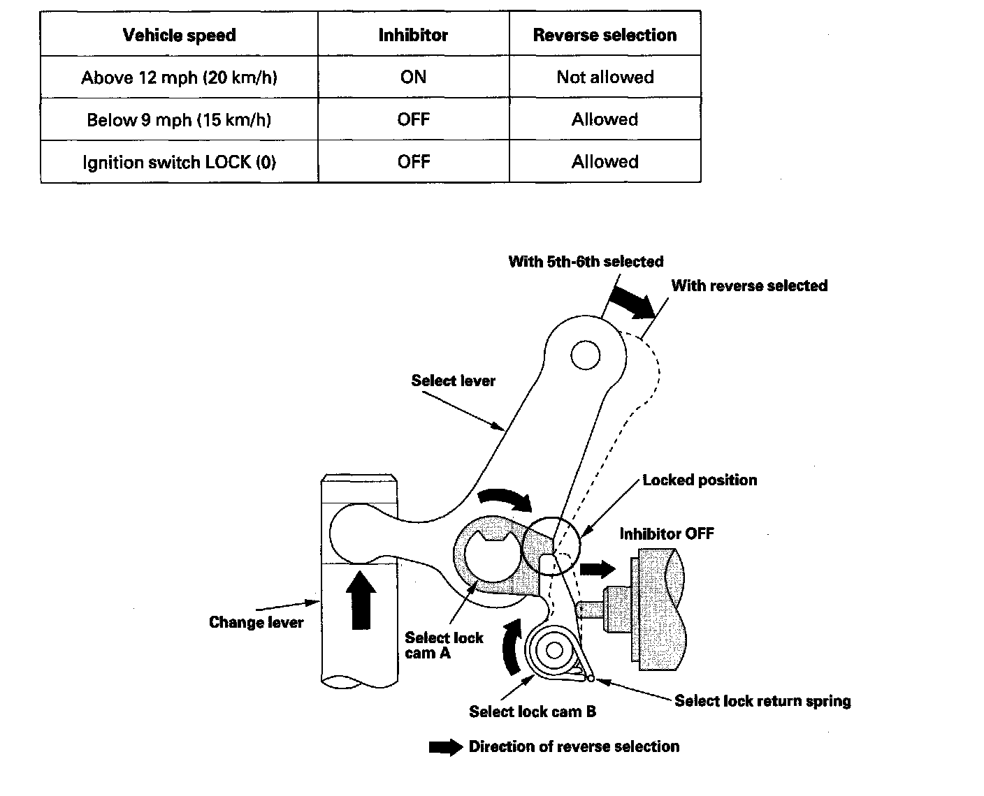 System DescriptionAt a vehicle speed of 12 mph (20 km/h) or more, the ECM receives a signal from the output shaft (countershaft) speed sensor and activates the reverse lockout solenoid, which pushes select lock cam B into the locked position. As a result, the select lever can not rotate to the reverse select position, making it impossible to engage reverse gear. At a vehicle speed of 9 mph (15 km/h) or less, the signal from the output shaft (countershaft) speed sensor is interrupted, the ECM turns off the reverse lockout solenoid. The select lock return spring pulls back select lock cam B, enabling the select lever to move freely so the reverse gear can be selected.
