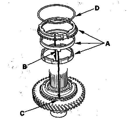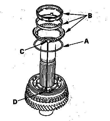4. Install the triple cone synchro assembly (A) by aligning the synchro ring fingers (B) with the grooves in 1st gear (C), then install the synchro spring (D).