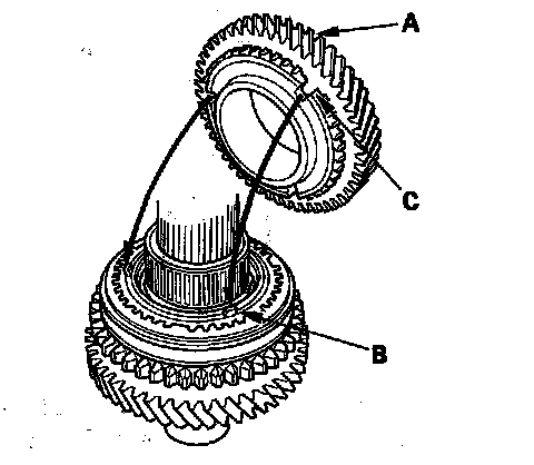 11. Install 2nd gear (A) by aligning the synchro cone fingers (B) with the grooves (C) in 2nd gear.