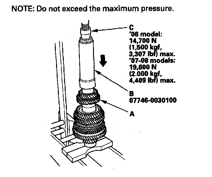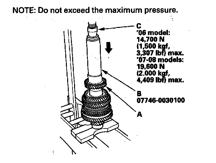 14. Install 5th gear (A) using the 40 mm I.D. driver (B) and a press (C).