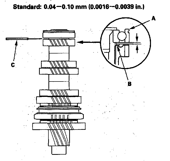 17. Measure the clearance between the old bearing (A) and the 35 mm shim (B) with a feeler gauge (C).
