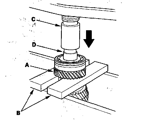 19. Support 6th gear (A) on steel blocks (B), then use a press (C) and an attachment (D) to press the countershaft out of the ball bearing.