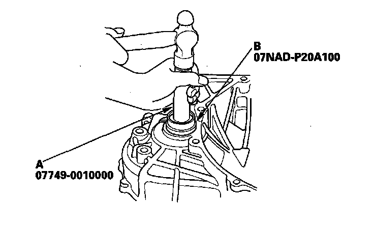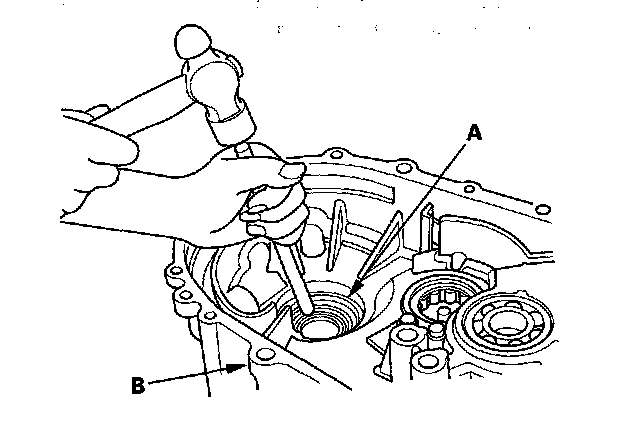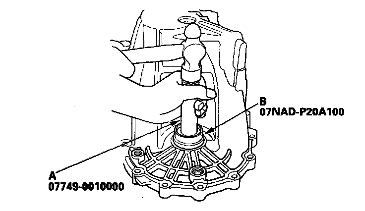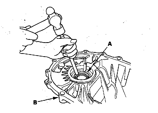 3. Install the new oil seal in the transmission housing with the driver (A) and oil seal driver attachment (B).