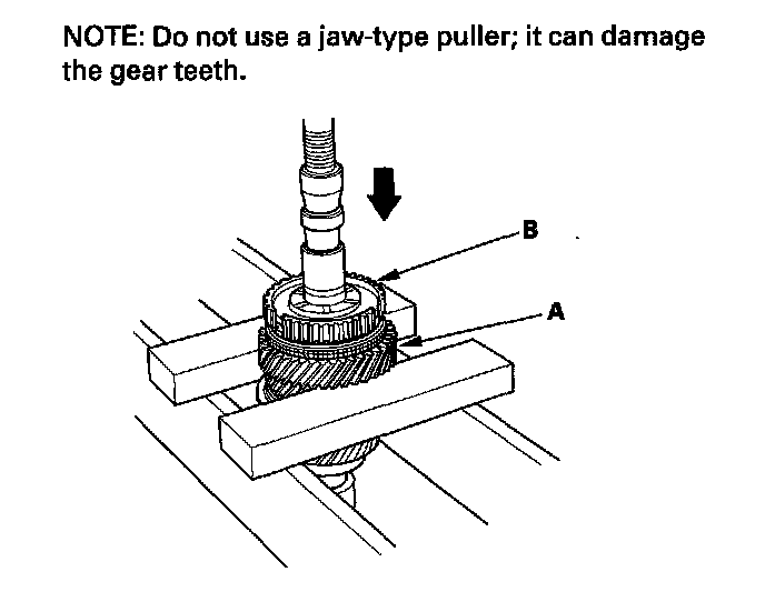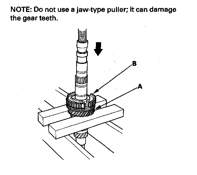 2. Support 5th gear (A) on steel blocks, and press the mainshaft out of the 5th/6th synchro hub (B).