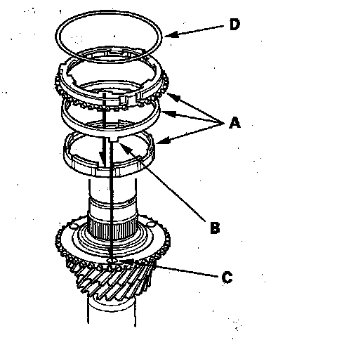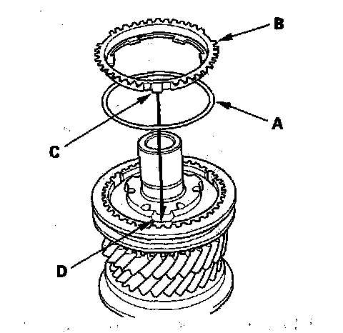3. Install the double cone synchro assembly (A) by aligning the synchro cone fingers (B) with the holes in 3rd gear (C), then install the synchro spring (D).