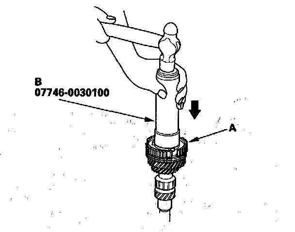 5. Install the 3rd/4th synchro hub (A) using the 40 mm I.D. driver (B).