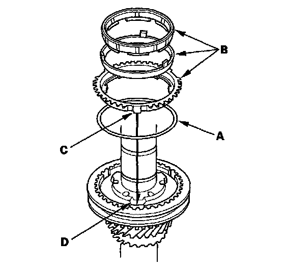 15. Install the synchro ring (B) by aligning the synchro ring fingers (C) with the grooves in the 5th/6th synchro hub (D).