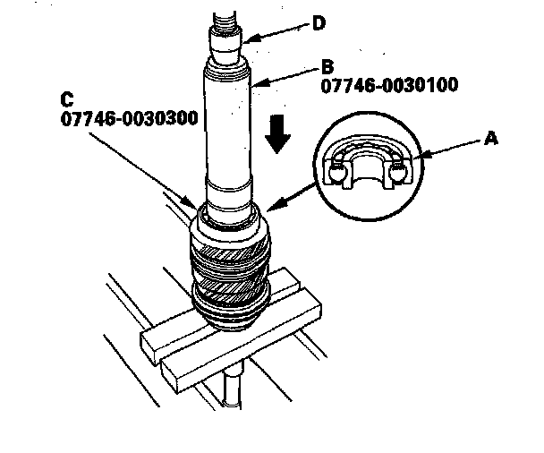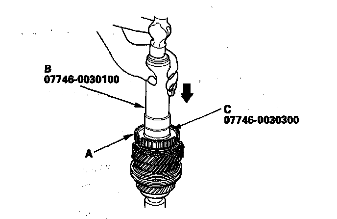 12. Install the 5th/6th synchro hub (A) using the 40 mm I.D. driver. (B) and 30 mm I.D. attachment (C).