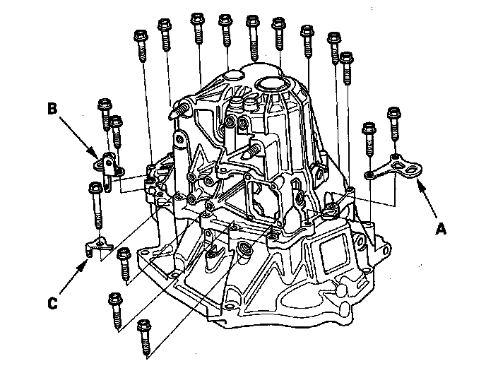 5. Remove the transmission hanger A, the transmission hanger B, and the harness bracket (C).