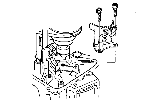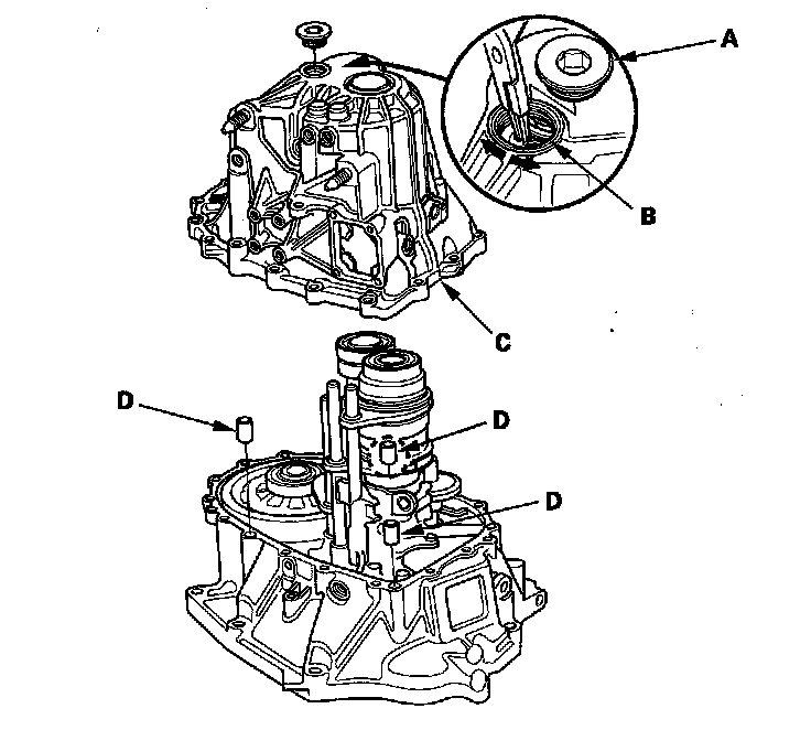 1. Remove the detent bolts (A), 12 mm washers (B) springs, steel balls, and the back-up light switch (C). Then remove the transmission hanger (D).