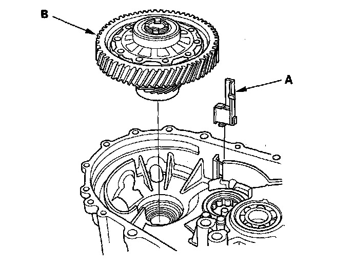 11. Lower the transmission housing the rest of the way as you expand the 72 mm snap ring (B). Release the snap ring so it seats in the groove of the countershaft bearing.