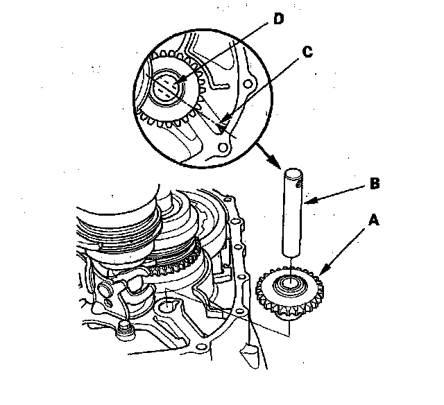 5. Install the reverse idler gear (A) and the reverse gear shaft (B) by aligning the mark (C) with the reverse gear shaft hole (D).