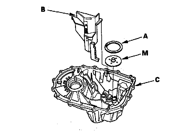 6. Select the proper size 72 mm shim (A) according to the measurements made during the Mainshaft Thrust Clearance Adjustment. Install the oil gutter plate (B), the oil guide plate M, and the 72 mm shim into the transmission housing (C).