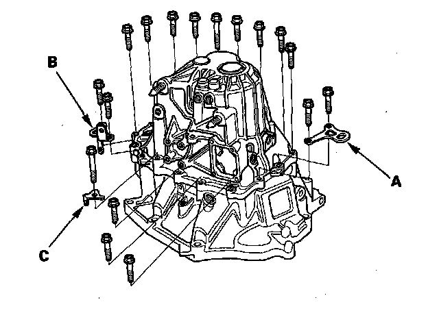 14. Install the transmission hanger A, the transmission hanger B, the harness bracket (C), and the 8 mm flange bolts finger tight.