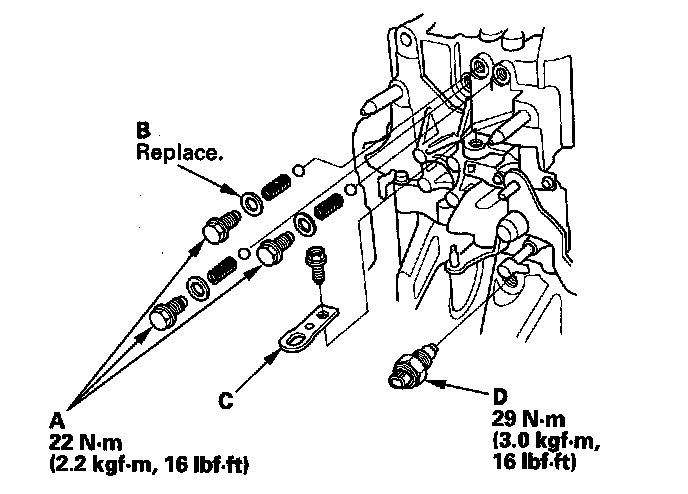 20. Install the drain plug (A) and 10 mm flange bolt (B) with new sealing washers (C). Install the filler plug (D) finger-tight.