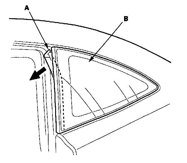 3. Remove the front seal (A) from the front edge of the quarter glass (B). If necessary, cut the front seal with a utility knife.