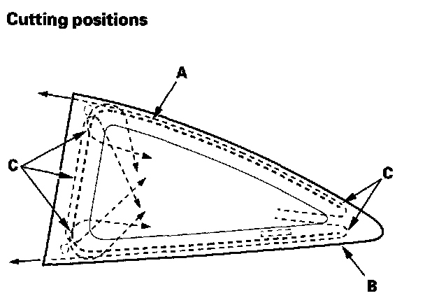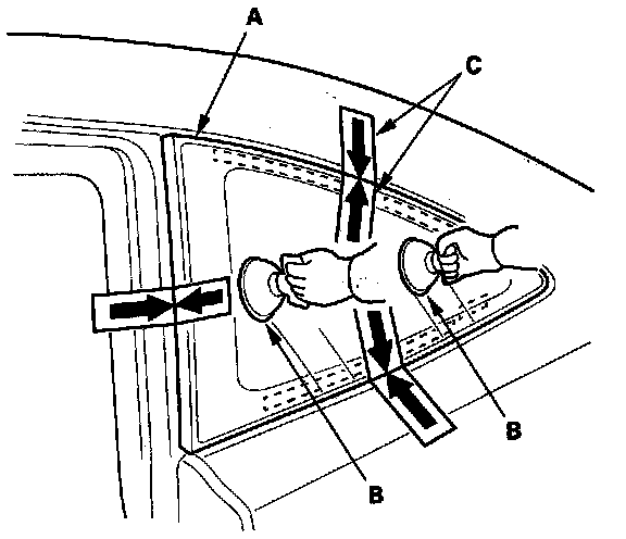 4. Carefully cut through the adhesive (A) at the rear corner portion of the quarter glass (B) with a utility knife. With a helper on the outside, pull the piano wire (C) back and forth in a sawing motion. Hold the piano wire as close to the quarter glass as possible to prevent damage to the body, and carefully cut through the adhesive around the entire quarter glass: