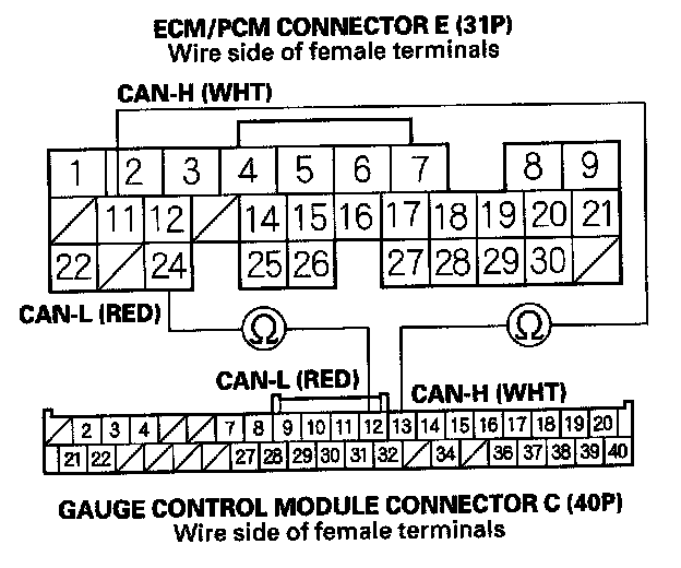10. Check for continuity between gauge control module connector C (40P) No. 12 and No. 13 terminals and ECM/PCM connector E (31P) No. 11 and No. 24 terminals respectively.