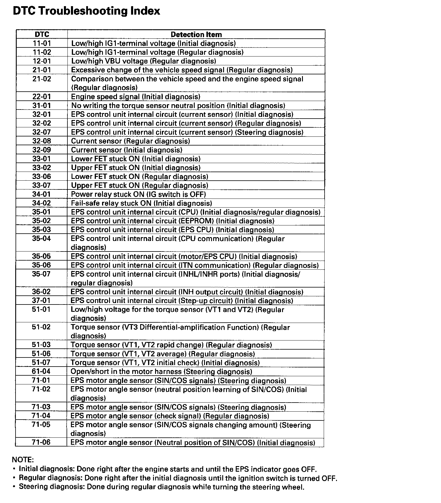 DTC List - Electrical Power Steering