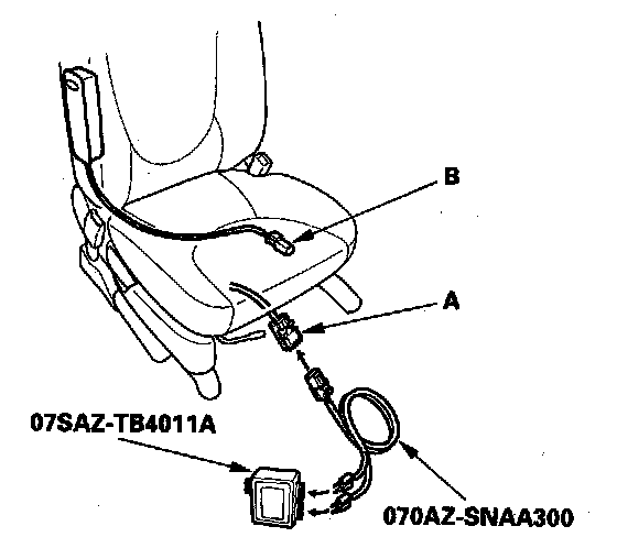 4. Disconnect the floor wire harness 2P connector (A) from the front passenger's side airbag (B).