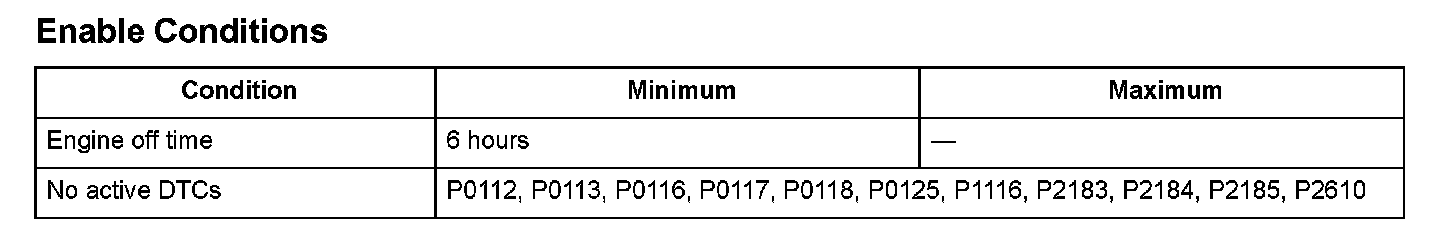A malfunction is detected if these three conditions are present after the engine and the ignition switch have been off for at least 6 hours: