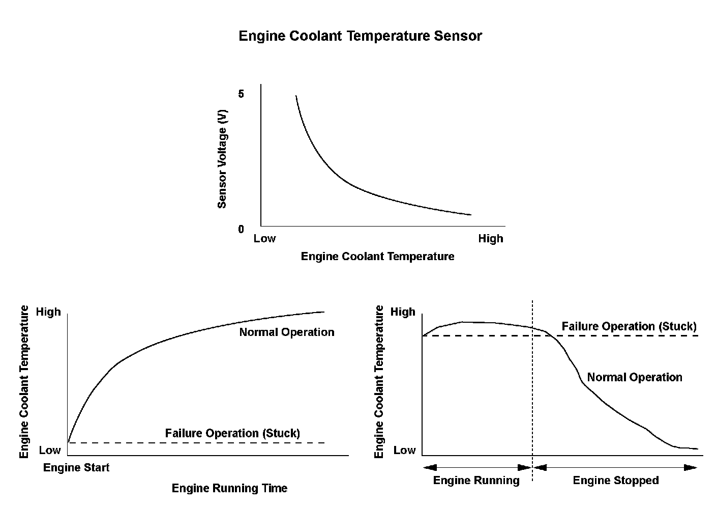 The engine control module (ECM)/powertrain control module (PCM) supplies voltage to the engine coolant temperature (ECT) signal circuit (about 5 V) through a pull-up resistor. As the engine coolant cools, ECT sensor 1 resistance increases, and the ECM/PCM detects a high signal voltage. As the engine coolant warms, ECT sensor 1 resistance decreases, and the ECM/PCM detects a low signal voltage.