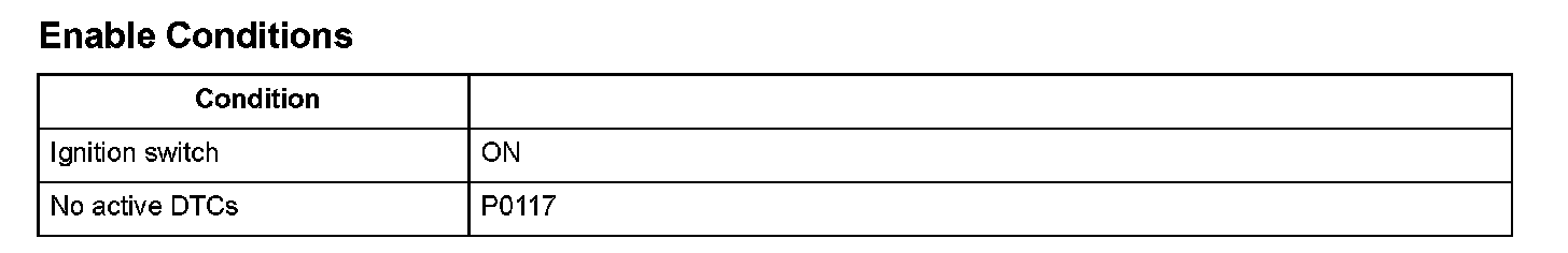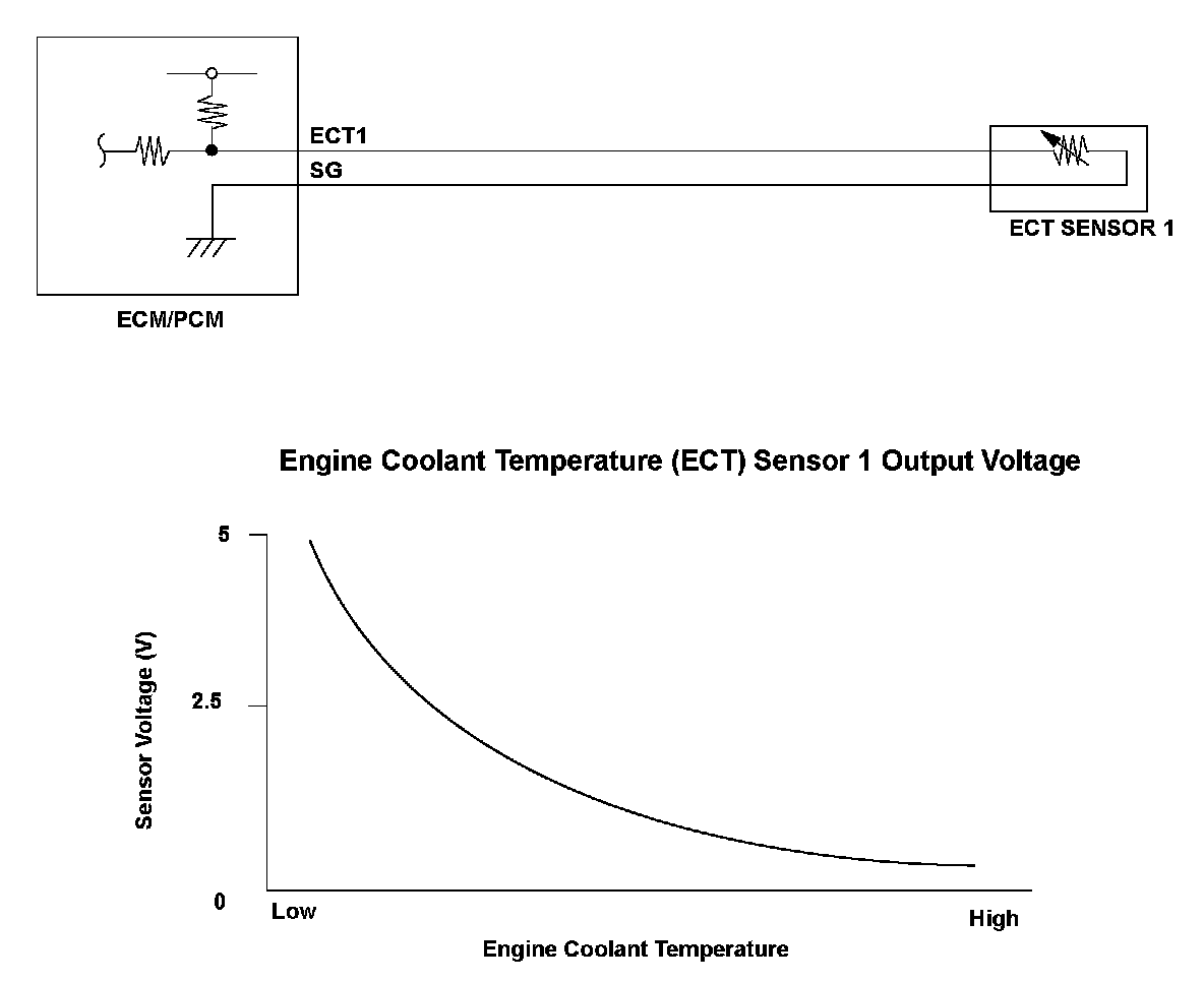 Engine coolant temperature (ECT) sensor 1 is used for air/fuel ratio feedback control, ignition timing control, idle speed control, and other functions. The ECT sensor 1 resistance varies depending on the engine coolant temperature. As the engine coolant cools, the ECT sensor 1 resistance increases, and the engine control module (ECM)/powertrain control module (PCM) detects a high signal voltage. As the engine coolant warms, the ECT sensor 1 resistance decreases, and the ECM/PCM detects a low signal voltage. If the ECT sensor 1 output voltage is more than a set value when the engine coolant temperature is low, the ECM/PCM detects a malfunction and a DTC is stored.
