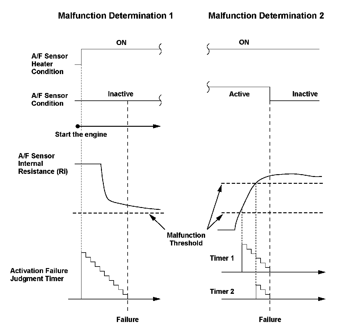 1. When the A/F sensor does not activate in a set time after the A/F sensor heater is turned on (with high A/F sensor internal resistance), a malfunction of the A/F sensor heater is detected, and a DTC is stored.