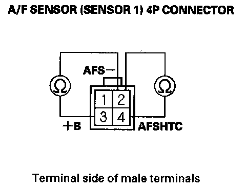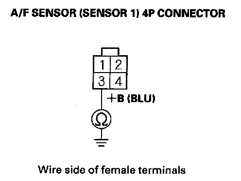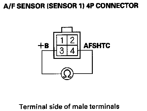 10. At the sensor side, measure resistance between A/F sensor (Sensor 1) 4P connector terminals No. 3 and No. 4.