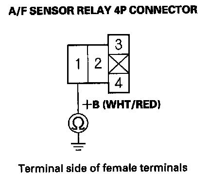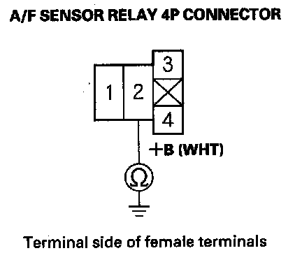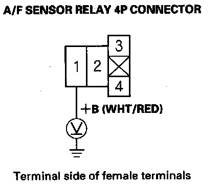 21. Measure voltage between A/F sensor relay 4P connector terminal No. 1 and body ground.
