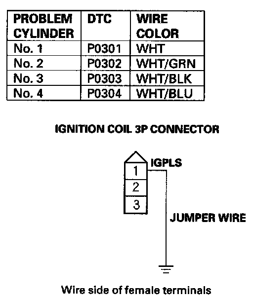 38. Connect appropriate ignition coil 3P connector terminal No. 1 to body ground with a jumper wire (see table).